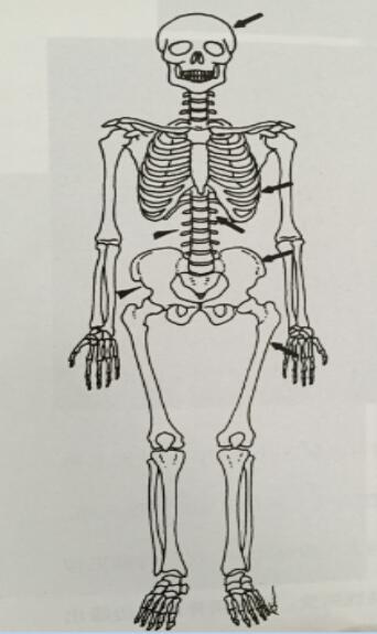 外,本一周氏蛋白亦非此病特有,其他疾病如骨骼转移癌、多发性肉瘤、纤维囊性瘤等多种疾病亦可呈阳性反应。 (2)高球蛋白血症和M蛋白出现 约95%的患者,血清球蛋白增多,白球蛋白比例倒置。做醋酸纤维膜电冰可见一异常电泳图形,即M球蛋白,其主要为一染色浓而密集的单峰突起的免疫球蛋白区带,少数有双峰。应用免疫电泳,按M蛋白成分的不同,可分为:①IgG型占50%~60%。②IgA型占20%~25%。③凝溶蛋白或轻链型占20%。④IgD型占1.5%,常伴有入轻链。⑤IgE型和IgM型,仅占0.5%和0.1%,。⑥“非分泌型”骨髓瘤,其血清中不能分离出M蛋白,约占1%。 4.其他 由于骨质广泛破坏,大量的钙进入血循环,出现高钙血液;晚期及肾功能不全患者,血磷可显著升高。血清碱性磷酸酶大多正常或轻度升高,此与骨转移癌有区别。血清尿素氮和肌酐增高。 六、X线检查 1.本病早期骨骼X线检查常无阳性改变。 根据肿瘤细胞动力学研究,只有当单位瘤细胞增殖至一定数量时才能出现X线可见的破坏灶。放大摄影有助于较早期发现。 表现为广泛性骨质密度减低,骨小梁变稀变细,骨皮质变薄,并有栗粒状骨质破坏,皮质不均,断续不连。出现骨质疏松部位易发病理性骨折,尤以肋骨、脊椎易发。