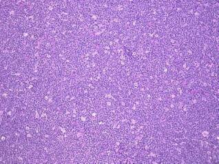 一、临床表现 1、常发生于上颌骨或下颚骨(非洲患者),腹腔器官(北美患者)和中枢神经系统 2、一般不累及外周淋巴结和脾,很少发生白血病 3、可侵及颌面部导致面部畸形,侵犯脑膜或脊髓,腹膜后淋巴结,肝肠肾等脏器 4、小无裂细胞型,恶性程度高,可能是人类生长最快的肿瘤 5、化疗效果好,大多数病人可以治愈 二、病理表现 病变部位表现为肿块,瘤组织呈鱼肉状、伴出血坏死。相邻器官受压和浸润。淋巴结受累少见,但淋巴结周围可被肿瘤包围。细胞单一、中等大小,弥漫浸润。固定后细胞有时呈铺路石或镶嵌样排列。核圆形、染色质粗,副染色质相对清晰,核中等大小、居中,嗜碱性。胞质深嗜碱、常伴有脂质空泡。印片中这些细胞的细微结构更容易观察。肿瘤增殖率很高(核分裂多见),并且细胞自发性死亡率高(凋亡)。“满天星”现象常见,这是巨噬细胞吞噬凋亡的肿瘤细胞所致。肿瘤细胞核的大小近似于“满天星”中的组织细胞核。