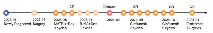 原发性中枢神经系统淋巴瘤(PCNSL)是一种罕见且侵袭性极强的非霍奇金淋巴瘤,发生于脑实质、脊髓、脑膜甚至眼部,是免疫特权部位的大B细胞淋巴瘤[1]。尤其是复发/难治性(R/R)PCNSL治疗缺乏标准、有效的方案,传统药物难以穿透血脑屏障,放疗放射性脑损伤风险大,患者生活质量和存活期均难以提升[2]。在该背景下,免疫治疗的新策略备受关注。格菲妥单抗(Glofitamab)作为CD20×CD3的双特异性抗体,已在系统性弥漫大B细胞淋巴瘤(DLBCL)领域展现优异疗效。其独特的2:1结构设计使其更强效地结合CD20阳性肿瘤细胞并招募T细胞杀伤肿瘤[3]。近日,格菲妥单抗新适应症已获得中国国家药品监督管理局的上市批准,联合吉西他滨与奥沙利铂(GemOx)用于治疗不适合自体造血干细胞移植(ASCT)的复发或难治性DLBCL非特指型(DLBCL NOS)成人患者(2L+ DLBCL)。 近期,南京医科大学第三附属医院(常州市第二人民医院)卢绪章教授团队报告了全球首例使用格菲妥单抗成功诱导复发PCNSL 患者达到快速、深度的完全缓解(CR),而且在治疗12 个周期后依然持续缓解[4]。这一成果不仅填补了该领域治疗空白,也为血脑屏障限制下的中枢肿瘤免疫治疗提供了宝贵的临床和基础数据。为深入解读该研究及格菲妥单抗在PCNSL治疗的未来潜力,【肿瘤资讯】专访了卢绪章教授,邀请其分享最新临床研究的核心亮点、机制解析及发展方向。 格菲妥单抗在复发PCNSL患者中实现快速深度缓解,突破传统治疗瓶颈 根据2022年WHO最新分类,PCNSL属于免疫特权区淋巴瘤,临床治疗困难且预后堪忧。患者即便初期接受高剂量甲氨蝶呤联合化疗、免疫治疗及放疗,仍有约25%-50%复发,且约15%-25%初始即为难治患者,导致整体生存率明显低于系统性淋巴瘤[5-7]。 基于此,团队启动格菲妥单抗治疗方案,患者经过两周期治疗后,即获深度缓解,连续12周期治疗维持CR,神经功能明显恢复,影像学检查无复发迹象,生存状态优良,治疗效果令人印象深刻(图1)。卢绪章教授强调:“这一突破不仅为R/R PCNSL患者带来了新的治疗方向,也验证了格菲妥单抗在穿越血脑屏障后实现有效免疫治疗的可行性,实现了临床领域的急需突破。”