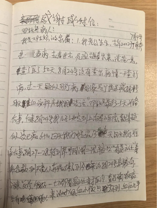 图:邓老先生妻子的手写信 05 谈起晁红颖医生及血液科的医护人员,邓老先生全家有说不完的感激和赞誉,并时常向其他病友讲起这段重生经历。然而,晁红颖却谦虚地说: “这就是医生的责任”