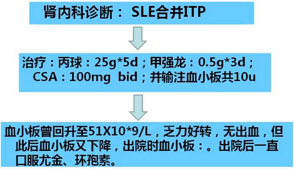 病史概要 患者性别:女 年龄:62岁 身高:155cm 体重:60.5Kg 现病史: 2012年07-20日因“发热、乏力一月”入住我院肾内科,完善检查后确诊为SLE,血常规三系正常,予环孢素(100mgbid)尤金(16mg bid)口服