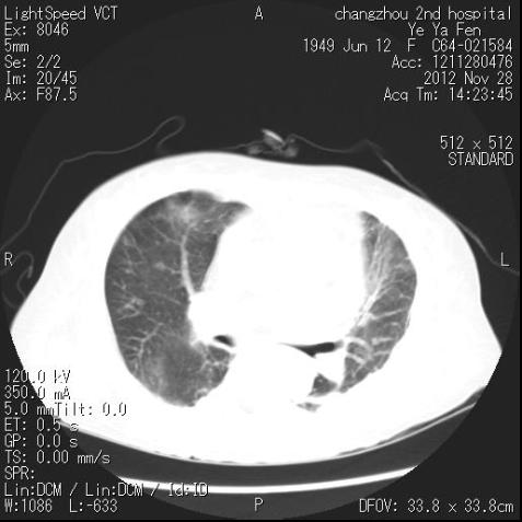 有“陈旧性心肌梗死”病史半年,我院心内科冠脉造影提示前降支、后旋支双支病变,狭窄均大于95%,予支架植入后口服氯吡格雷至今。 家族史 父母已故多年,死因不详,兄弟姐妹及子女体健。 体格检查及辅助检查 查体:T:36.8℃,双上肢及胸腹部皮肤多发瘀斑、瘀点,两肺弥漫性湿罗音,双上肢肌力四级,右下肢肌力3级,左下肢肌力2级,腱反射减弱,巴氏征阴性。 凝血常规:正常,尿蛋白:0.7g/d 肺部CT检查