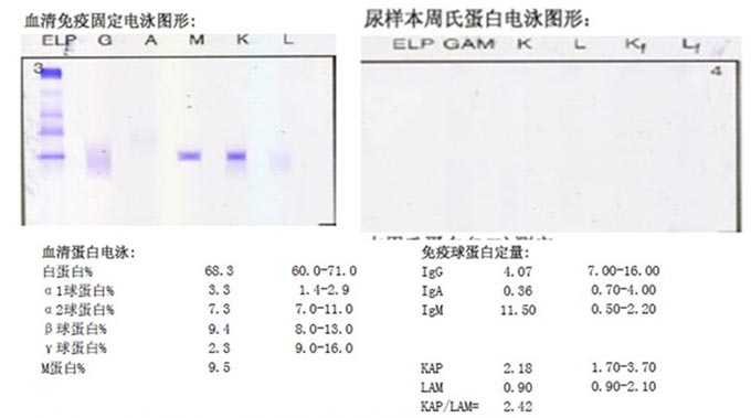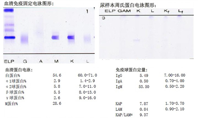 免疫球蛋白定量:IgM 20.70g/L,KAP 3.83g/L